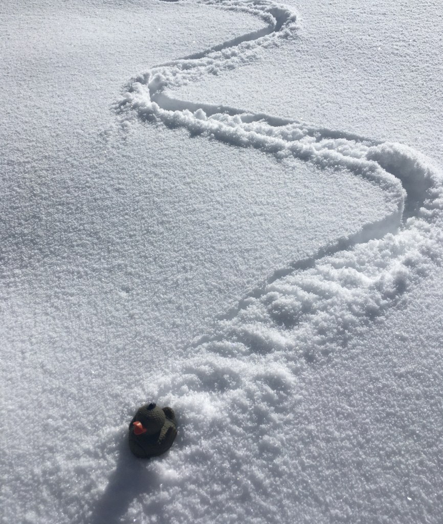 Some surprising things have come out of posting photos of the places Olive has visited. First, I am having unexpected fun creating scenarios for Olive’s experiences and seeing who responds.   There were the times Olive sat on John Harvard’s toe, rode an e-bike in Vermont, and “took flight” over the Colorado River at Dead Horse State Park. She recently “went skiing” in fresh powder we found on Hahn’s Peak during a hike, and followed up with an “apres ski” float in a hot tub.