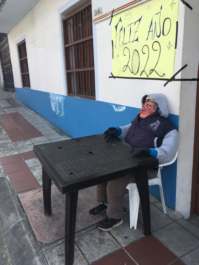 Al and I went for a stroll through the center of Loja at around 9:00 p.m. in search of New Year’s revelers. We were surprised at the lack of action in the streets, although perhaps we shouldn’t have been, because Covid restrictions and precautions are real here, and pretty universally followed. Beyond a few small clusters of young friends sharing drinks, a group of tween girls making Tik Tok videos, and some drunk viudas interfering with the few cars out and about, the streets were pretty quiet. We walked down one side street between the main plaza and the river and passed street vendors desperately trying to sell off the last of their sparklers and firecrackers as well as one man with piles of lacy, yellow panties for sale for one dollar each. Aside from that, only a hairdresser’s shop with clients and a couple of fruit and vegetable stores with no customers were open. We could hear music thumping from a few discos and the occasional burst of firecrackers but otherwise the partying seemed to be confined to people’s private spaces.